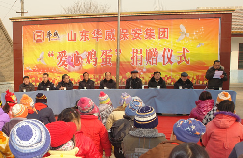 元月14日上午,滿載著華威保安集團(tuán)員工濃濃愛意的汽車駛向曲阜市南辛鎮(zhèn)中心小學(xué),華威保安集團(tuán)在這里隆重舉行了愛心雞蛋捐贈(zèng)儀式,向南辛鎮(zhèn)所有小學(xué)一年級的學(xué)生每人捐贈(zèng)一箱雞蛋。山東華威保安集團(tuán)愛心雞蛋工程正式進(jìn)入校園,集團(tuán)公司董事長、總裁荀金慶與市關(guān)工委、教育局、南辛鎮(zhèn)的有關(guān)領(lǐng)導(dǎo)出席了捐贈(zèng)儀式。