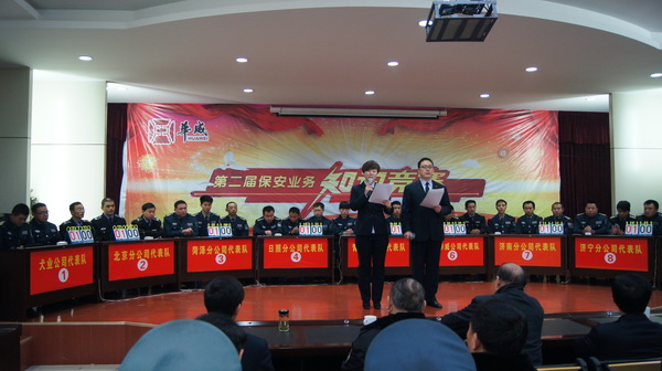 為進一步提高保安隊員綜合素質(zhì)和業(yè)務(wù)技能,檢驗崗位練兵成效,為客戶提供更優(yōu)質(zhì)的服務(wù),全面實現(xiàn)全年各項任務(wù)目標,結(jié)合公司“素質(zhì)提升年”活動的開展,公司組織了此次競賽活動,競賽內(nèi)容涉及《集團概況》、《保安員基礎(chǔ)知識》、《華威企業(yè)文化》、《時事政治及有關(guān)法律法規(guī)》等內(nèi)容,每場比賽分必答、搶答、論述題三個部分。來自集團各分公司、子公司的9支代表隊共27名選手參加了比賽。決賽過程競爭激烈、高潮迭起、精彩紛呈。各代表隊以知識實力論高下、爭第一,以團結(jié)協(xié)作、默契配合提升團體形象,選手們精神飽滿、思維敏捷、沉著應(yīng)答,現(xiàn)場觀眾踴躍參與,主持人幽默、風(fēng)趣的串詞,為緊張的競賽增添了輕松活躍的氛圍,體現(xiàn)了員工良好的文化素質(zhì)和精神風(fēng)貌。集團公司董事長、總裁荀金慶、常務(wù)副總裁楊中河、黨總支副書記李曉虎、監(jiān)事會主席米永友、副總裁姚彥偉等公司領(lǐng)導(dǎo)與二百多名員工觀看了比賽。