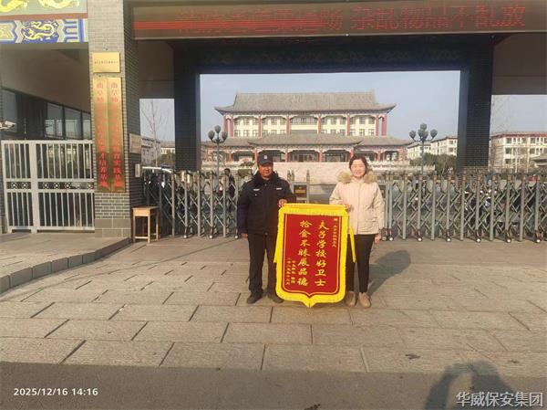 2025年12月16日,一面寫有“夫子學(xué)校好衛(wèi)士,拾金不昧展品德”的錦旗被送到了夫子學(xué)校,送旗人是該校初中部一名學(xué)生的家長,以此感謝華威保安曲阜分公司夫子學(xué)校項目部隊員...