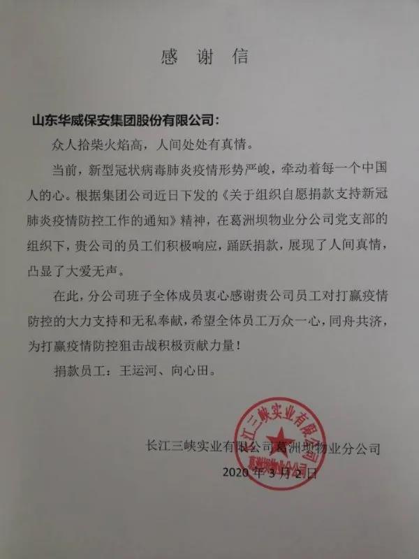 此外,王運(yùn)河同志還帶動(dòng)隊(duì)員積極踴躍參加了甲方組織的為抗擊疫情愛(ài)心捐款活動(dòng),為抗疫活動(dòng)捐獻(xiàn)自己的一片愛(ài)心。事后,甲方客戶為表感謝,特意向我山東華威保安集團(tuán)股份有限公司發(fā)來(lái)感謝信一封,衷心感謝我公司員工對(duì)打贏疫情防控攻堅(jiān)戰(zhàn)的大力支持和無(wú)私奉獻(xiàn)。
